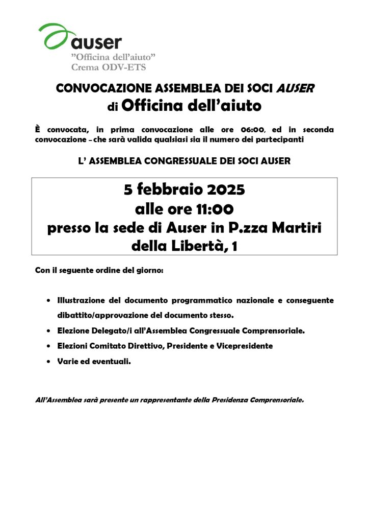 AttivitàOfficina dell'aiuto Crema Assemblea Congressuale Auser Officina dell’Aiuto ODV-ETS 🗓 8 Gennaio 2025 Segreteria 5 Febbraio 2025 from 11:00 to 13:00 Scheduled Attività Officina dell'aiuto Crema