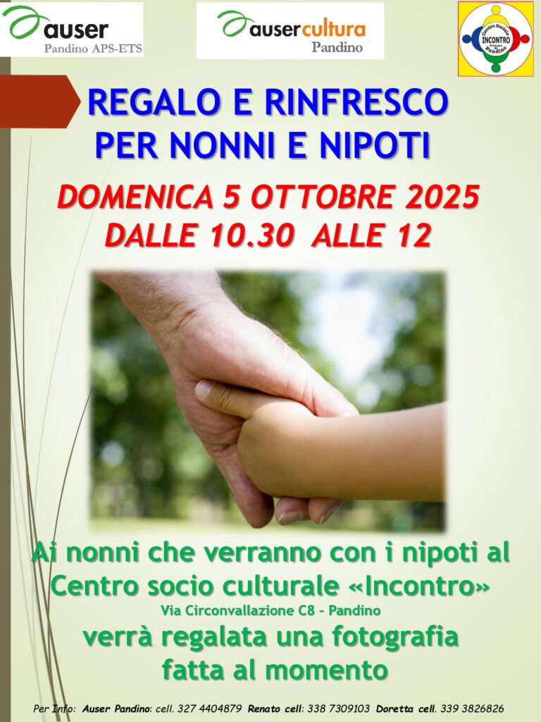 AttivitàCopertinaNovitàPandino Auser Pandino – Festa dei nonni / 5 ottobre 2025 1 Ottobre 2025 Segreteria Condividiamo con voi l’iniziativa promossa da Auser Pandino per la festa dei nonni. Vi aspettiamo domenica 5 ottobre 2025 dalle 10:30 alle 12:00, presso il Centro Socio Culturale “Incontro”.