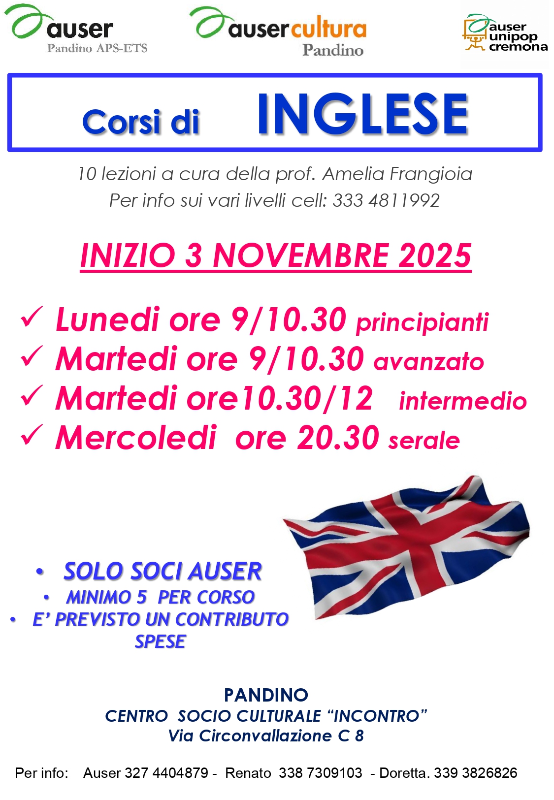 AttivitàCopertinaNovitàPandino Corsi di Inglese con Auser Pandino 7 Ottobre 2025 Segreteria Condividiamo con voi in corsi di inglese organizzati da Auser Pandino.