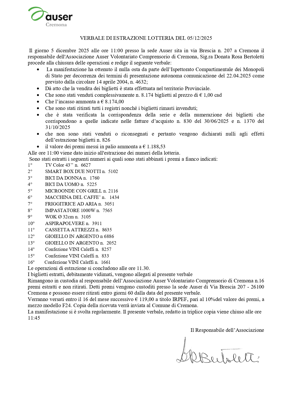 ecco il verbale di estrazione dei biglietti vincenti della lotteria Auser Provinciale